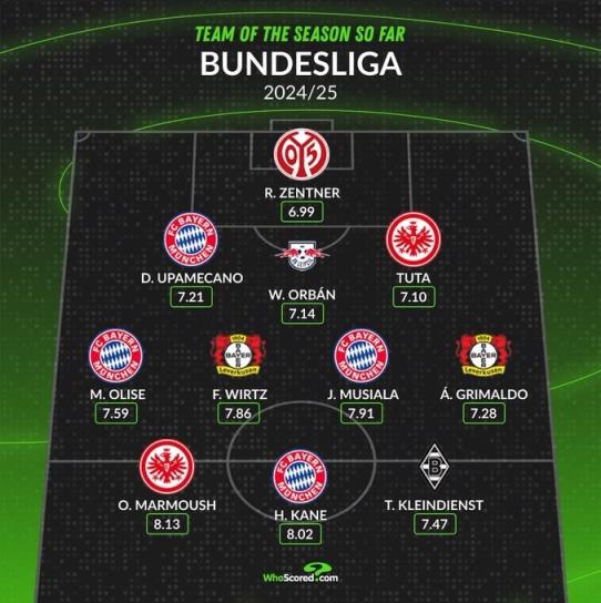 12月24日讯 Whoscored评选了赛季至今的德甲最佳阵容,凯恩领衔,拜仁4将入选。