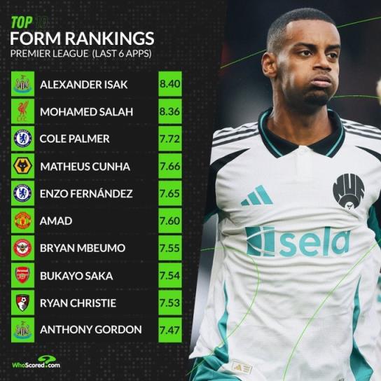 12月25日讯 WhoScored统计了英超球员近6场比赛的评分排名,伊萨克8.4分居首,具体排名如下: