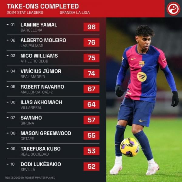 12月28日讯 squawka统计了西甲联赛2024年度成功过人情况,亚马尔以96次居首。