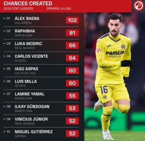 12月28日讯 年终岁末,《Squawka》盘点了西甲本年度创造机会top10,比利亚雷亚尔的巴埃纳以102次居首,拉菲尼亚和莫德里奇位居二三位。