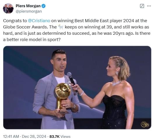 12月28日讯 环足奖官方宣布,C罗当选2024环足奖最佳中东球员。皮尔斯-摩根更新社媒,称赞了C罗。
