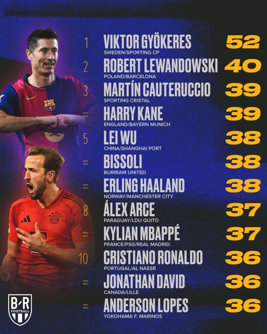 1月1日讯 BR统计了2024年球员在俱乐部的进球排行榜,约克雷斯52球居首,莱万、凯恩分居二三位,武磊第5位。