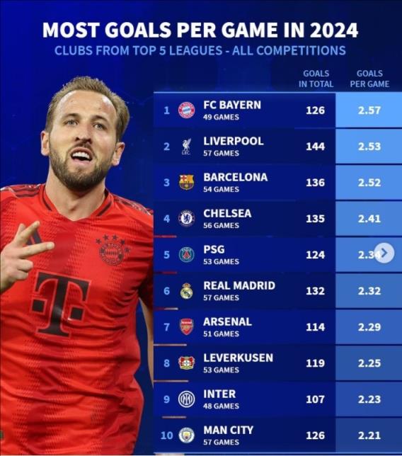 1月2日讯 根据德转数据,拜仁是2024年五大联赛场均进球最多的球队,这支德甲球队各项赛事场均打进2.57球。