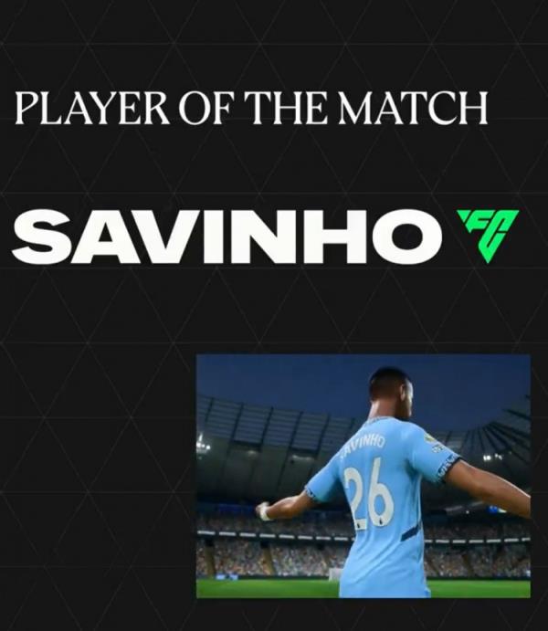 1月5日讯 本轮英超比赛中,曼城4-1大胜西汉姆。赛后,曼城官方宣布,萨维尼奥当选队内全场最佳球员。