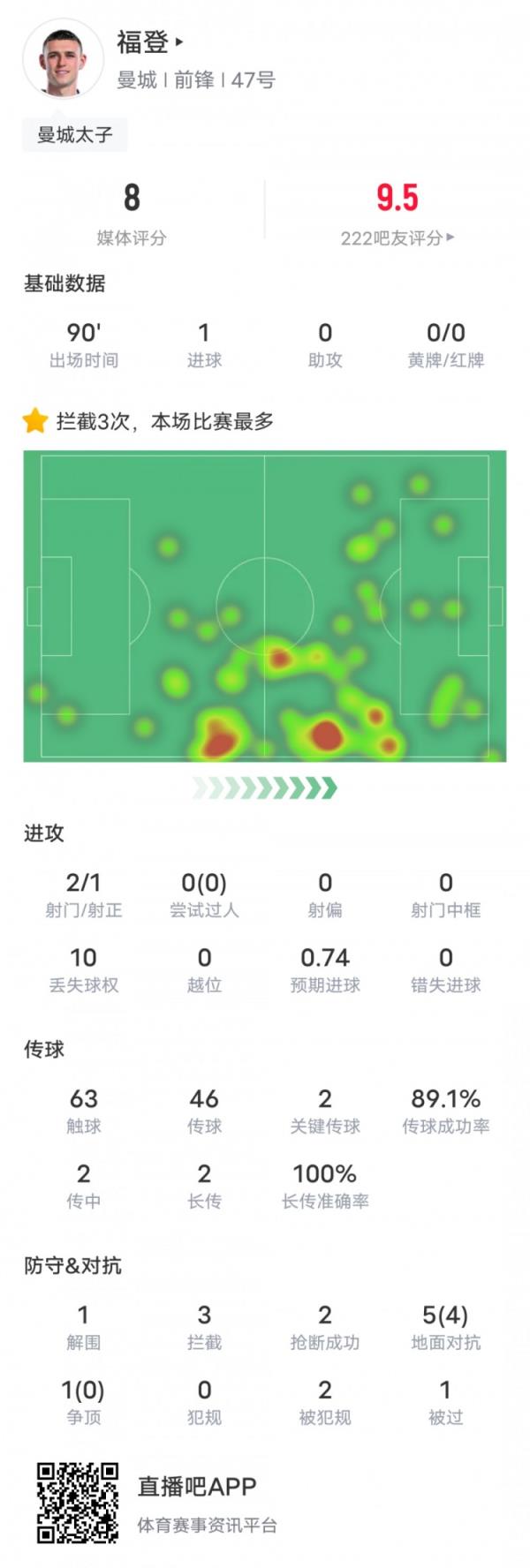 福登本场比赛数据如下: