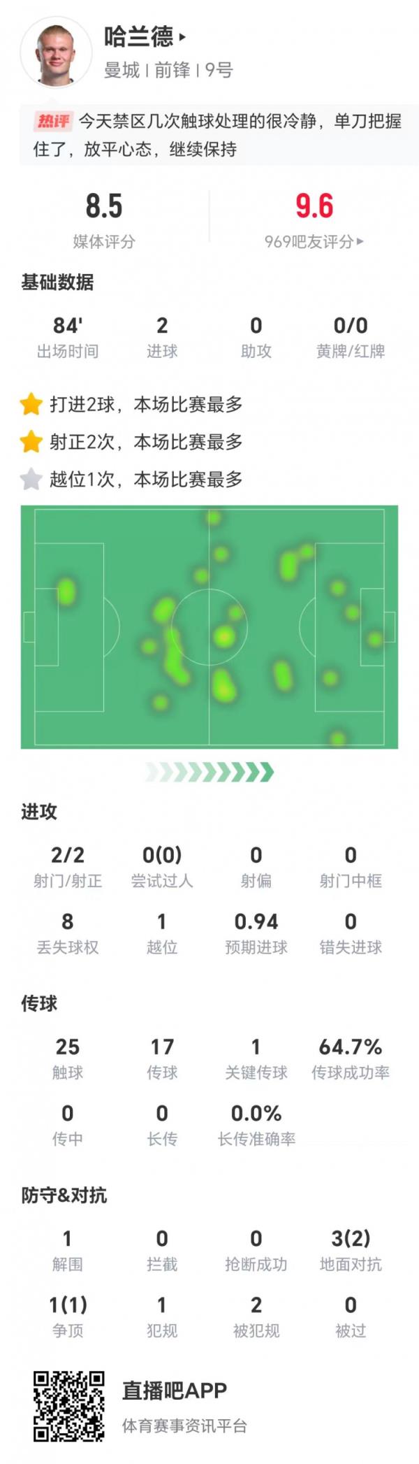 技术统计数据显示,哈兰德本场比赛两次射门中目标就打进两球,挪威人还有一次关键传球。另外,哈兰德3次一对一拼抢成功两次,1次争抢头球获得成功。对于哈兰德的表现,sofascore打分8.5分。