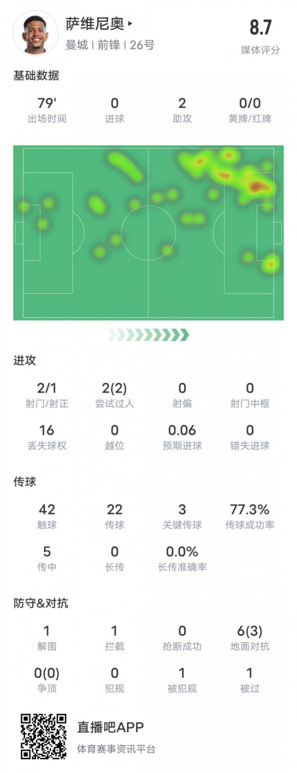 1月5日讯 英超联赛第20轮,曼城主场对阵西汉姆,萨维尼奥首发出战,造成对手打进1粒乌龙球,还贡献2次助攻,2次过人均成功,还送出3次关键传球,评分8.7。