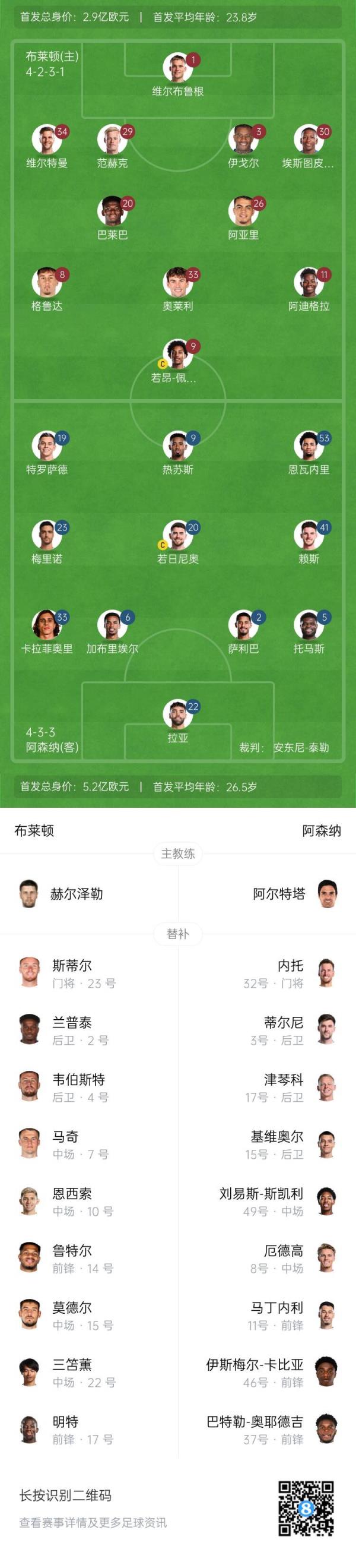 布莱顿首发:1-维尔布鲁根、34-维尔特曼、29-范赫克、3-伊戈尔、30-埃斯图皮尼安、20-巴莱巴、26-阿亚里、33-奥莱利、8-格鲁达、11-阿迪格拉、9-若昂-佩德罗