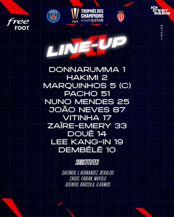 1月5日讯 北京时间1月6日00:30,法国超级杯,巴黎vs摩纳哥,赛前双方首发名单公布。