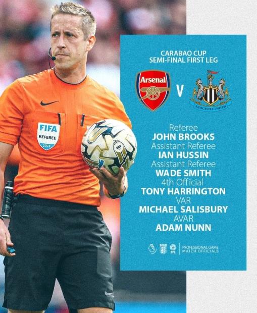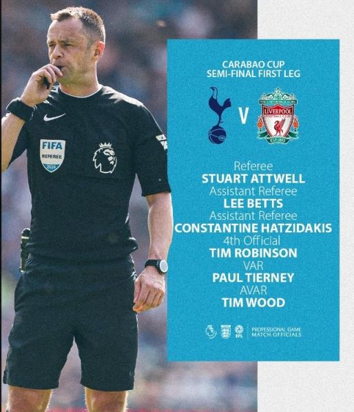 1月7日讯 联赛杯首回合裁判安排出炉,其中约翰-布鲁克斯将执法阿森纳VS纽卡,斯图亚特-阿特维尔将执法热刺VS利物浦。