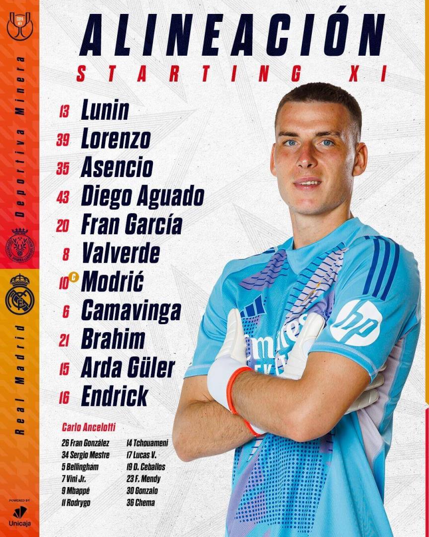 皇马首发:13-卢宁、39-洛伦佐-阿瓜多、35-劳尔-阿森西奥、43-迭戈-阿瓜多、20-弗兰-加西亚、8-巴尔韦德、10-莫德里奇、6-卡马文加、21-迪亚斯、15-居勒尔、16-恩德里克
