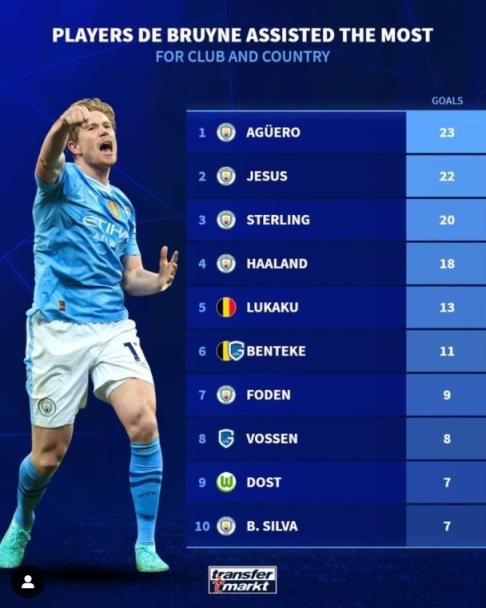 3月1日讯 根据德国转会市场网统计,阿圭罗是被德布劳内助攻次数最多的球员,达到23次,热苏斯、斯特林、哈兰德分列二三四位。