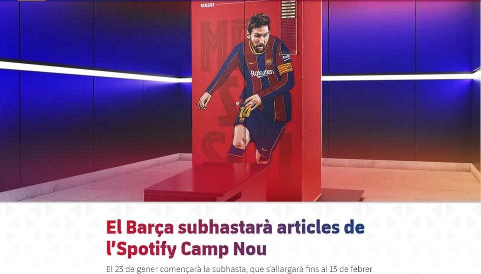 01月08日讯 巴萨官方消息,将拍卖诺坎普多个物品,包括球员使用过的衣柜、点球点草皮、角旗杆等,时间为1月23号至2月13号。据悉,梅西使用过的衣柜起拍价为35万美元。