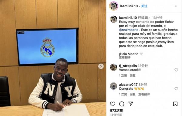 1月11日讯 莱加内斯官方宣布和皇马就出售18岁中卫拉米尼-法蒂(Lamini Fati)达成协议,球员社交媒体晒出与皇马签约照。