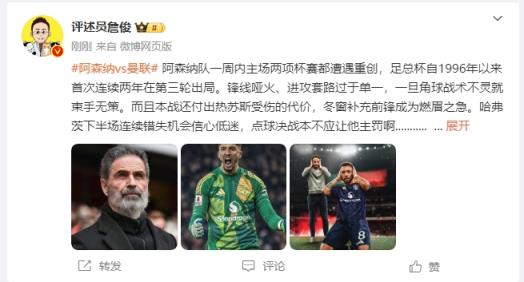 01月13日讯 本轮足总杯,曼联120分钟1-1战平阿森纳,点球战曼联取胜。赛后,评述员詹俊发文。