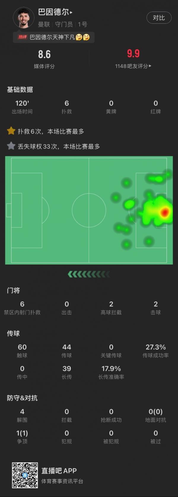 1月13日讯 在刚刚结束的足总杯第三轮比赛中,十人作战曼联通过点球大战淘汰阿森纳。本场比赛,巴因德尔发挥神勇,全场6次扑救,常规时间中扑出厄德高点球,又在点球大战中扑出哈弗茨点球。