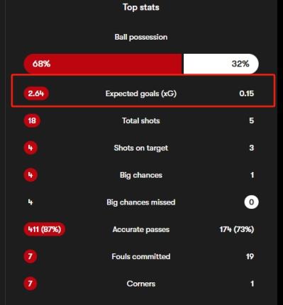 90分钟的时间里,阿森纳控球率达到68%,预期进球数为2.64个,而对手曼联仅为0.15个。阿森纳18脚打门4次射正,曼联5脚打门3次射正。