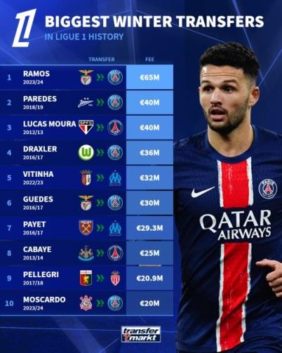 1月14日讯 今年的冬季转会冬窗已经开启,德国转会市场统计了法甲历史上冬窗最贵引援排行榜。其中,巴黎有7名引援上榜,贡萨洛-拉莫斯6500万欧成为标王,帕雷德斯、小卢卡斯4000万欧并列第二。