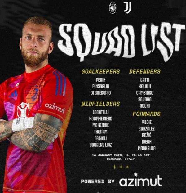 1月14日讯 北京时间周三凌晨的意甲第19轮比赛,尤文将前往客场挑战亚特兰大。目前,斑马军团已经公布了本场比赛的大名单,DV9缺阵,伊尔迪兹、小维阿出战。