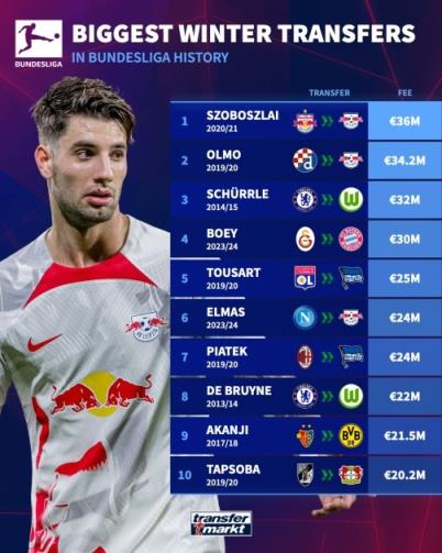 1月14日讯 德国转会市场统计了德甲历史上冬窗引援转会费最高的前十名球员,与五大联赛其余联赛相比,德甲的冬窗稍显平淡。其中索博3600万欧居首,奥尔莫3420万欧排在第二。