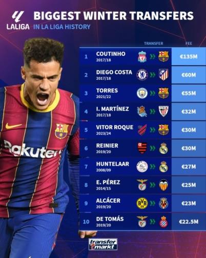 1月14日讯 今年的冬季转会窗口已经开启,德国转会市场统计了西甲历史上冬窗最贵引援前十名。其中,巴萨豪掷1.35亿欧引进库蒂尼奥居首,6000万欧加盟马竞的迭戈-科斯塔第二,