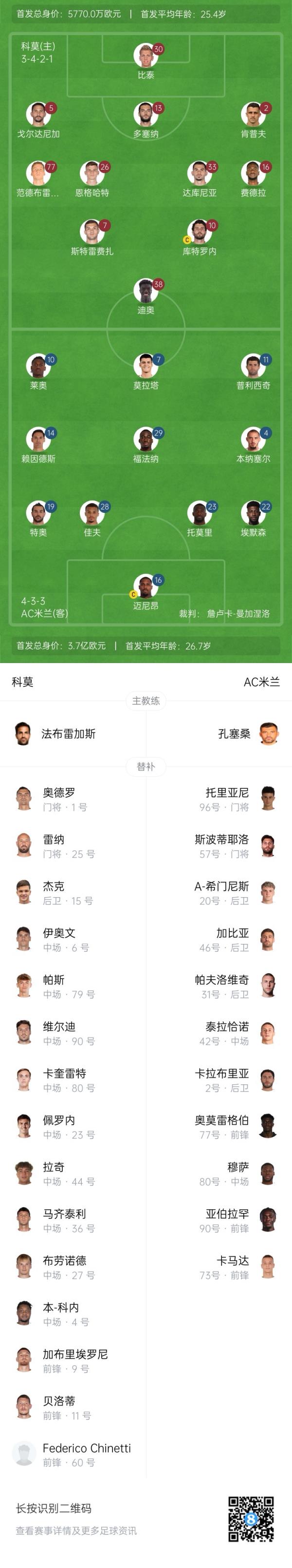 科莫替补:1-奥代罗、25-雷纳、15-费利佩-杰克、6-伊奥文、79-尼科-帕斯、90-维尔迪、80-卡奎雷、23-马克西莫-佩罗内、44-纳兹-拉兹、36-马齐泰利、27-布劳诺德、4-本-科内、9-加布里埃罗尼、11-贝洛蒂、60-基内蒂