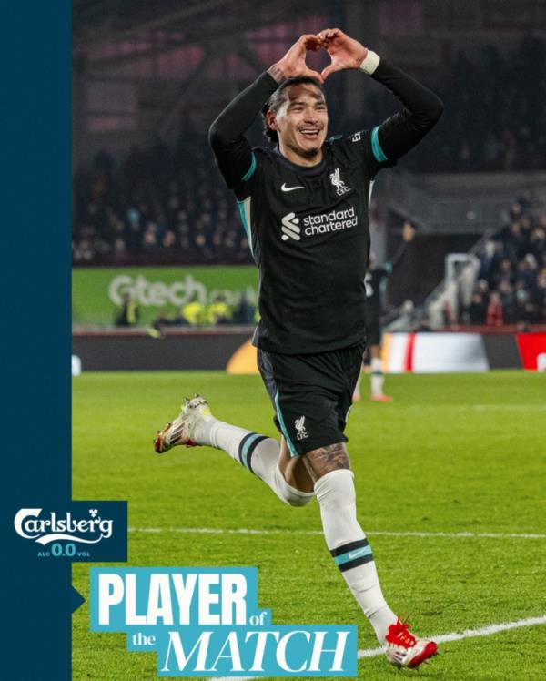 1月19日讯 英超第22轮,努涅斯补时梅开二度,帮助利物浦2-0绝杀布伦特福德。赛后,他毫无悬念地当选了利物浦队内最佳球员。