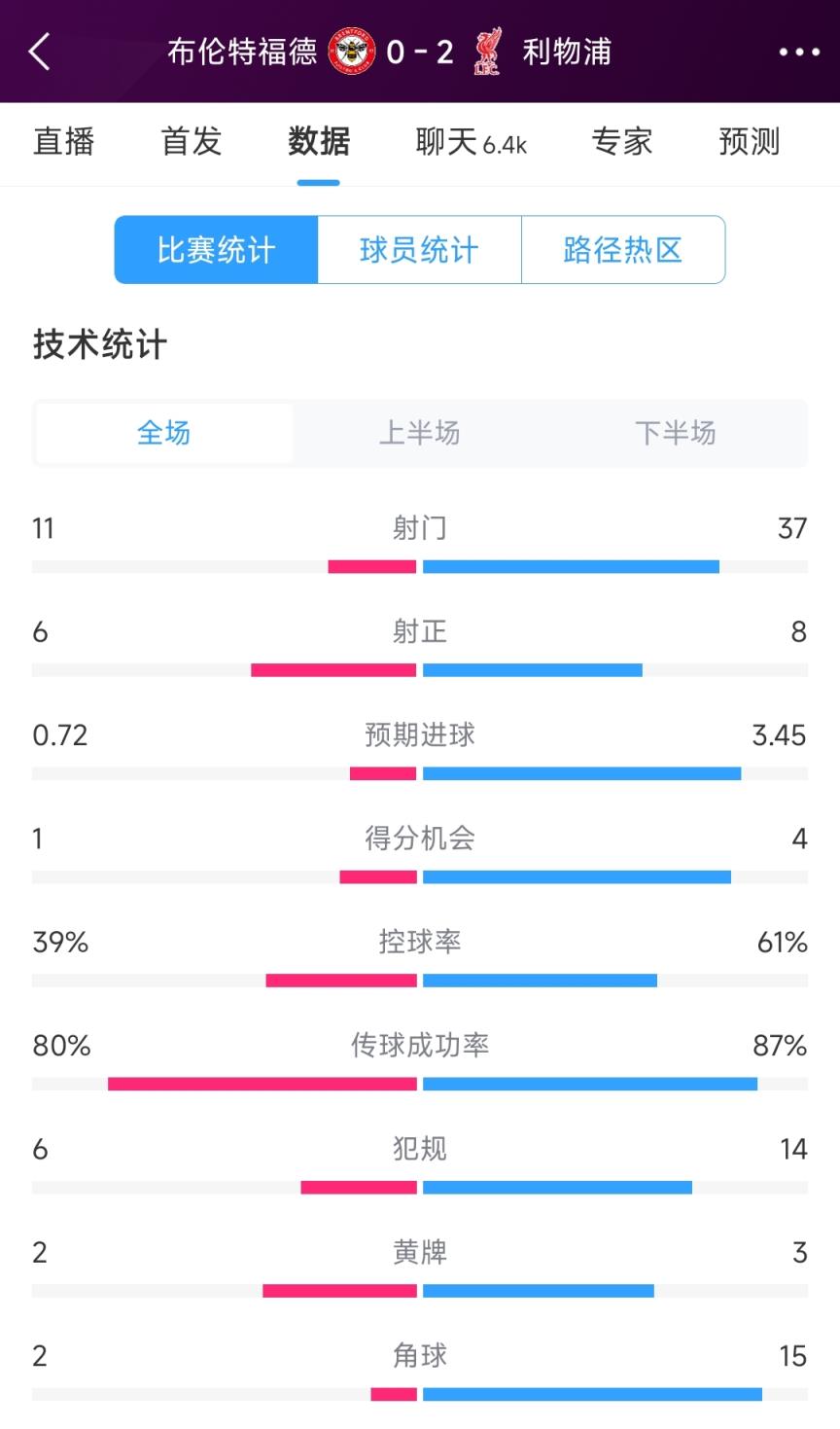 全场数据方面,利物浦牢牢占据了场面主动,全场比赛利物浦共有37脚射门,获得15个角球。据统计,本场的利物浦是近三个赛季五大联赛单场射门最多的球队。