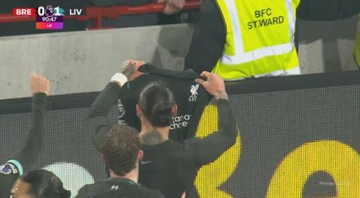 01月19日讯 利物浦vs布伦特福德补时第一分钟,阿诺德助攻努涅斯破门,进球后努涅斯脱衣庆祝,随后又举起自己的球衣向看台展示。