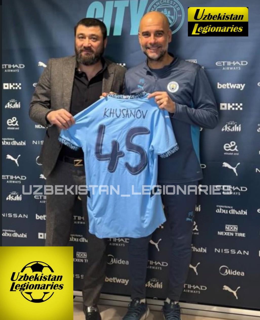 库萨诺夫的父亲、乌兹别克斯坦前国脚哈西莫夫与瓜迪奥拉手举库萨诺夫的45号球衣合影↓