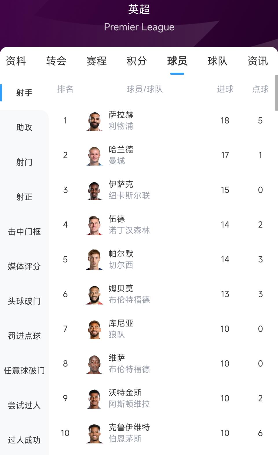 射手榜方面,萨拉赫18球领跑,哈兰德17球第二,伊萨克15球第三。