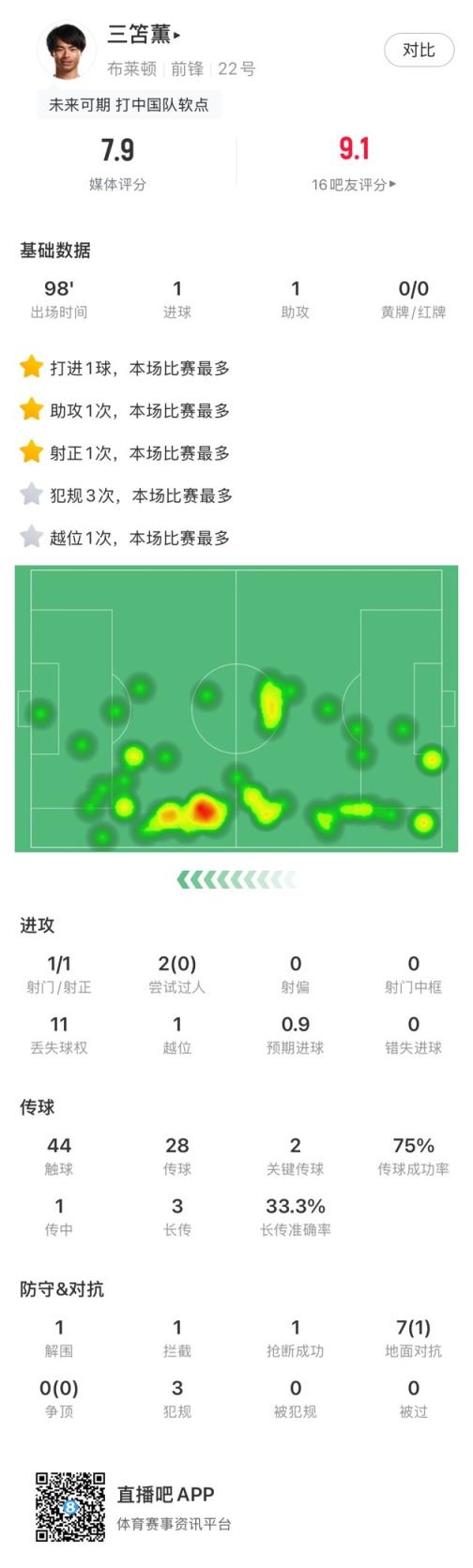 三笘薰本场比赛数据如下: