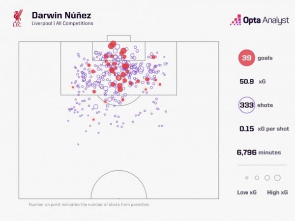 努涅斯利物浦生涯一共出场了6796分钟时间,射门了333次,打进39球,预期进球50.9,每次射门的预期进球0.15。