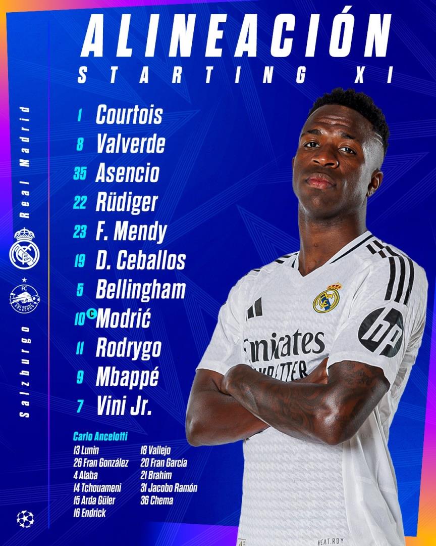 1月23日讯 欧冠联赛阶段第7轮,皇马主场对阵萨尔茨堡红牛。赛前,皇马官方提前公布了本场的首发名单。