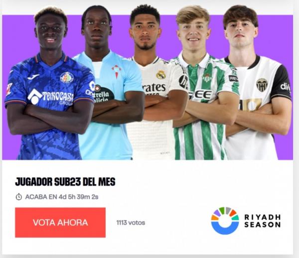 1月23日讯 西甲官方公布了1月最佳U23球员的提名名单。其中,贝林厄姆领衔。
