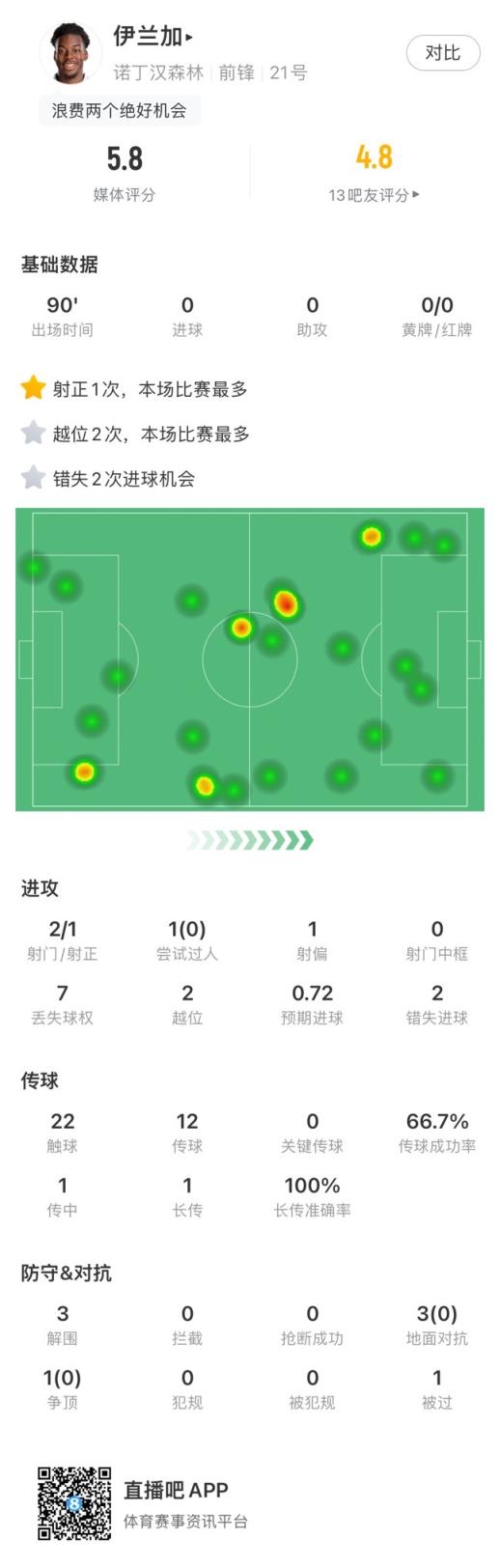本场比赛诺丁汉森林前锋伊兰加多次错失机会,赛后他收获全场最低评分5.8分。
