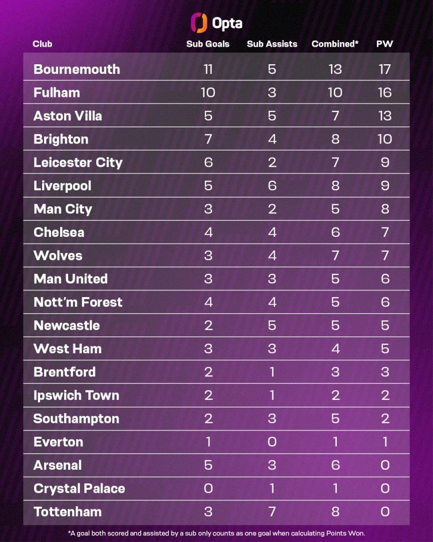 OPTA统计显示,伯恩茅斯替补本赛季直接参与13球,为球队赢下17分,均为联赛最多。富勒姆(16分)、阿斯顿维拉(13分)和布莱顿(10分)的替补表现也相当出色。
