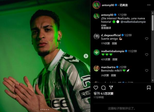 安东尼晒出身穿贝蒂斯球衣的照片,并写道:忙碌的一天结束了!开始新的故事!