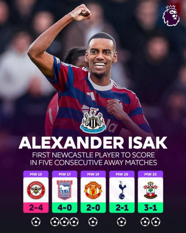 根据统计,伊萨克成为了纽卡队史上第一位连续5个英超客场比赛取得进球的球员。