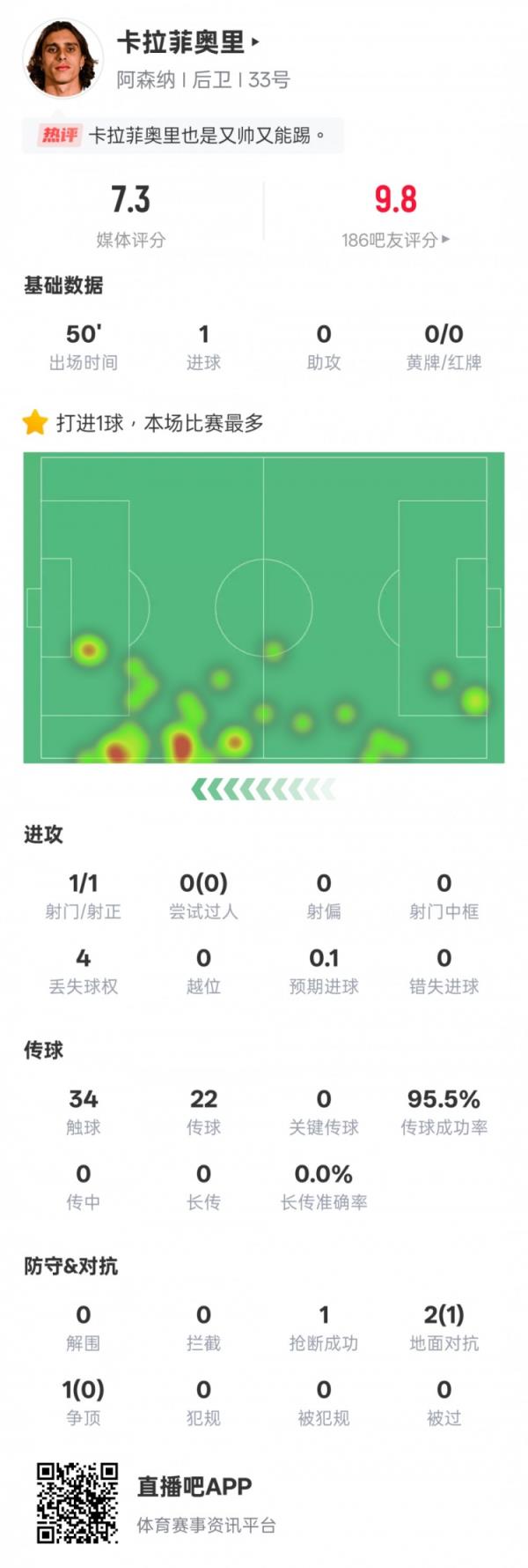 1月26日讯 英超第23轮,阿森纳客战狼队,卡拉菲奥里替补出战,打进制胜进球,传球成功率达到95.5%,评分7.3。