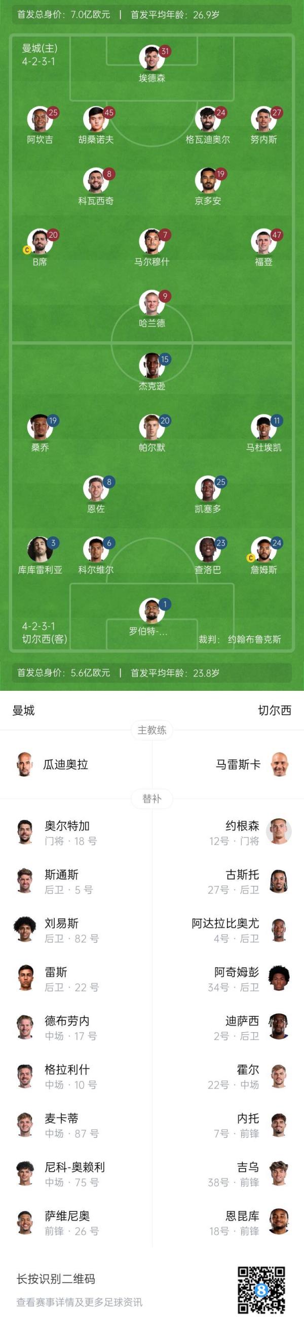 曼城首发:31-埃德森、25-阿坎吉、45-胡桑诺夫、24-格瓦迪奥尔、19-京多安、27-努内斯、8-科瓦西奇、20-B席、47-福登、7-马尔穆什、9-哈兰德