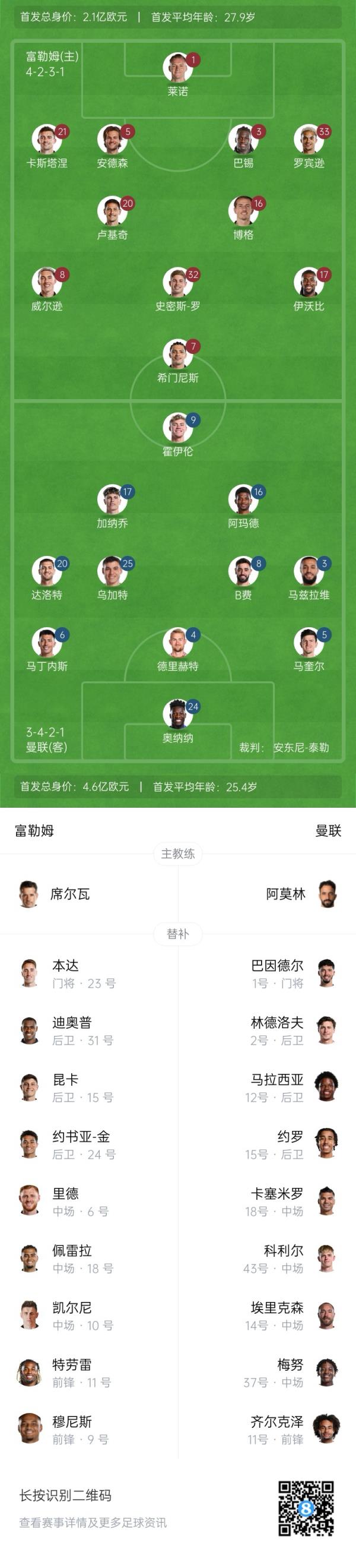1月27日讯 北京时间1月27日星期一03:00,英超第23轮富勒姆坐镇主场克拉文农场球场迎战曼联,目前双方已经公布了本场比赛的首发阵容。
