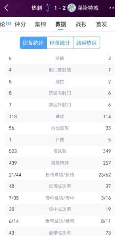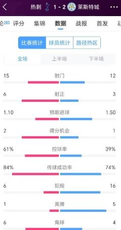 赛后技术统计数据显示,热刺射门数15次,莱斯特城射门12次。热刺控球率达到61%,全队仅有6次犯规,而莱斯特城多达16次。在其他数据方面,热刺35次传中仅成功7次,莱斯特城16次传中成功3次。