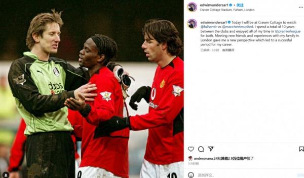 范德萨:“今天,我将前往克拉文农场观看富勒姆vs曼联比赛,我在这两家俱乐部总共效力了10年时光,我很享受在这两家俱乐部度过的所有英超时光。和我的家人一起在伦敦结识新朋友的经历给了我一个新的视角,这也为我的职业生涯带来了成功的时期。”