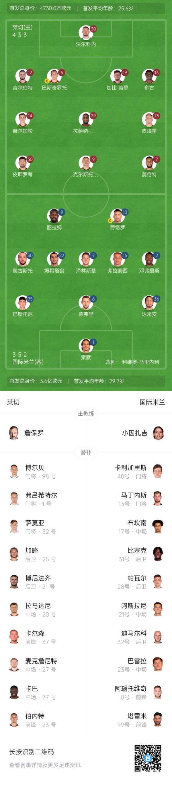 莱切首发:30-法尔科内、6-巴斯奇罗托、12-吉尔伯特、13-多古、19-加比-吉恩、14-赫尔加松、29-拉萨纳-库利巴利、75-皮埃雷、7-莫伦特、9-克尔斯托维奇、50-皮耶罗蒂