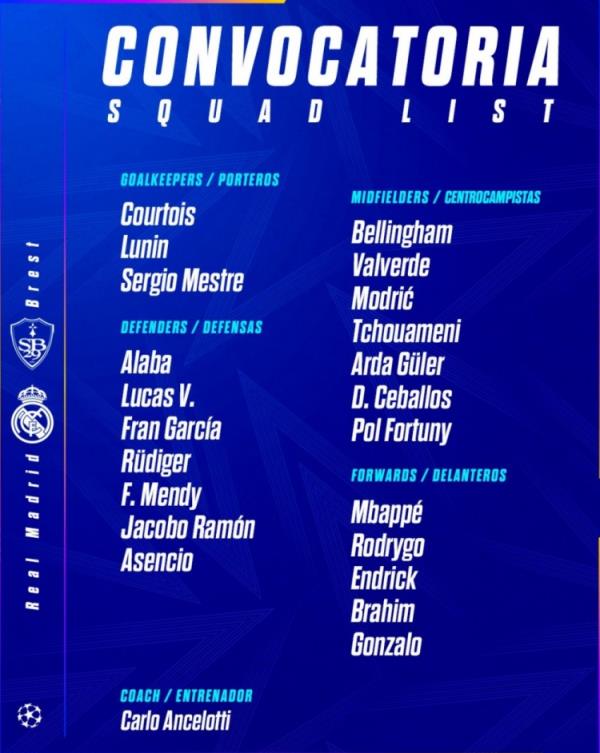 1月28日讯 北京时间本周四凌晨4:00欧冠联赛阶段收官战,皇马将在客场对阵布雷斯特。赛前,皇马官方公布了将出战本场比赛的大名单。