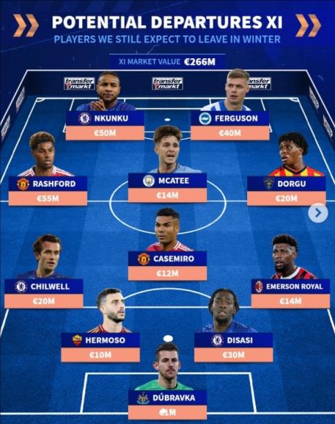 1月28日讯 德转社媒列出冬窗关窗前仍有可能离队的11人阵容,卡塞米罗、拉什福德在列,切尔西3人入围。