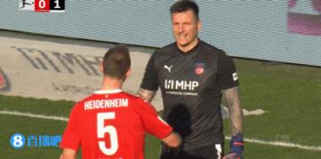 03月02日讯 德甲第24轮,海登海姆主场对阵法兰克福。第38分钟,海登海姆后卫贝尼迪克特-吉姆博回传,海登海姆门将凯文-穆勒准备迎球开大脚,结果球到门将跟前时突然跳起“过掉”门将缓缓滚入球网,造成了贝尼迪克特-吉姆博的乌龙球。