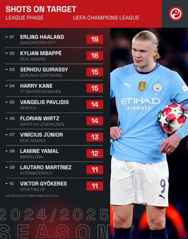 1月31日讯 欧冠联赛阶段已经正式收官,Squawka统计了联赛阶段所有球员射正次数的排行榜,其中,哈兰德和姆巴佩排在前二。