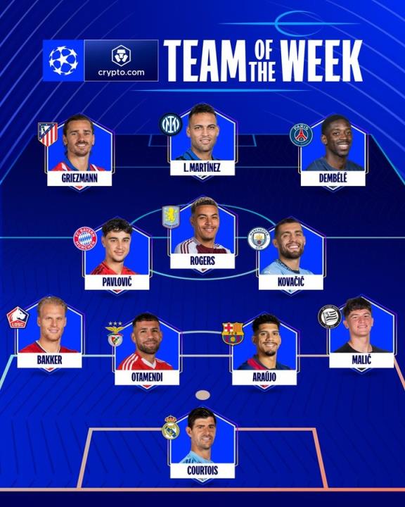 中场:帕夫洛维奇(拜仁)、罗杰斯(维拉)、科瓦契奇(曼城)